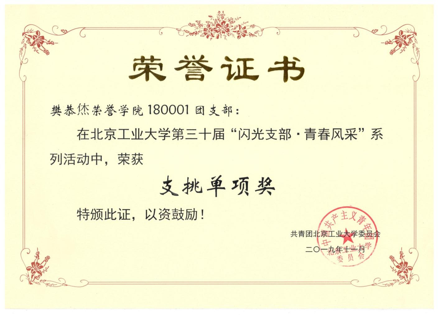180001团支部 荣获 闪光支部 青春风采 支挑单项奖