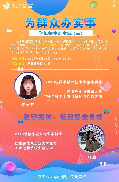 应新生实际需求,开展系列专业介绍活动。2022年03月23日下午,学院在第四教学楼510组织开展了“数字媒体、信息安全”专业分享活动。学院邀请了2018级数字媒体技术专业沈子艺和2018级信息安全专业张骁两位学姐,2021级全体新生和辅导员戴璐老师参与了本次活动,班主任助理陈宇卿主持。