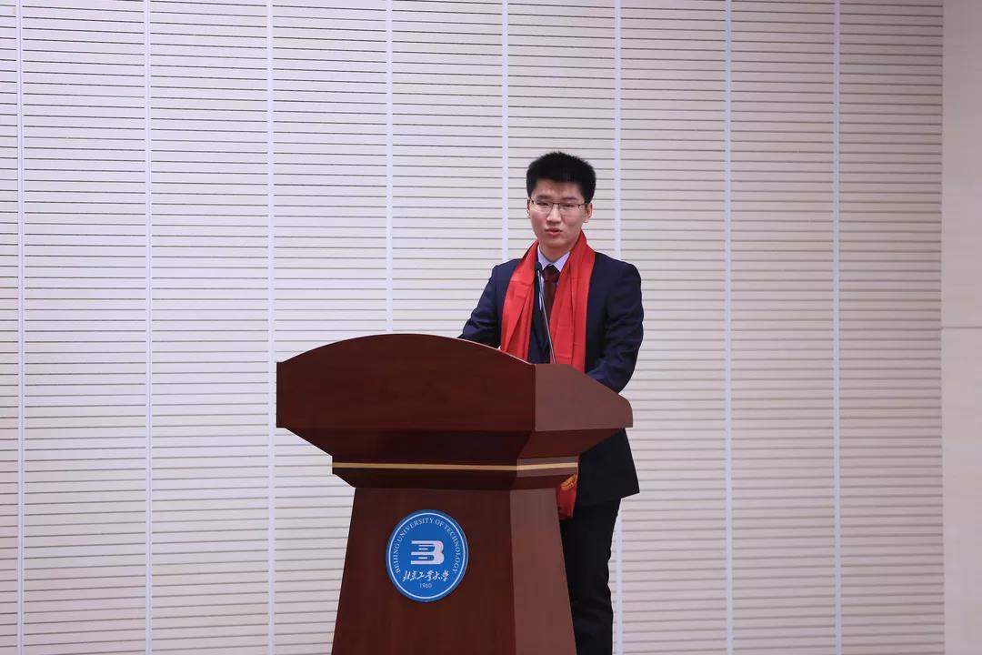 副校长吴斌教授为获得国家奖学金、校长奖学金的同学韩柳彤、陈慎颁奖。韩柳彤同学发言,他不仅学习成绩优异,GPA4.0,还担任我院团委副书记的职务,在众多学生工作中都有突出表现。韩柳彤理想信念坚定,言语真挚、温和而笃定的跟大家分享了自己的经历,感谢学院提供的平台和锻炼,鼓励大家不仅要积极参加试验项目、境外高校学习,拓宽视野,更要全心全意为学生服务,坚持以青年为本、深深植根青年、充分依靠青年,一切为了青年。