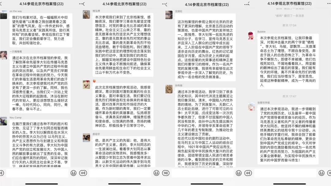 通过本次北京市档案馆的参观,我了解到革命先驱李大钊在传播马克思主义与建立中国共产党的过程中所做出的突出贡献,以及共产党员们早期在革命过程中所做出的努力。今天我们的幸福生活是用革命先辈们的血汗换来的,本次参观让我对共产党的历史有了更深一步的了解。同样,我也深感责任重大。作为沐浴在新时代的年轻人,当我们又一次站在党的伟大征程新的起跑线,更应该想想怎么接好这一棒。与新时代同心、同向、同行。青春不息,奋斗不止。