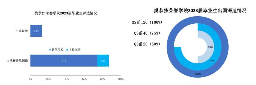 2023届毕业质量再创新高,自建院9年来首次完成深造率100%!毕业生中,选择在内地和香港特别行政区的大学深造的学生占比87%,其中13%的同学选择继续留在本校深造;另有13%的学生前往国外深造,出国深造的学生中前往QS世界排名前40大学的学生占比75%。