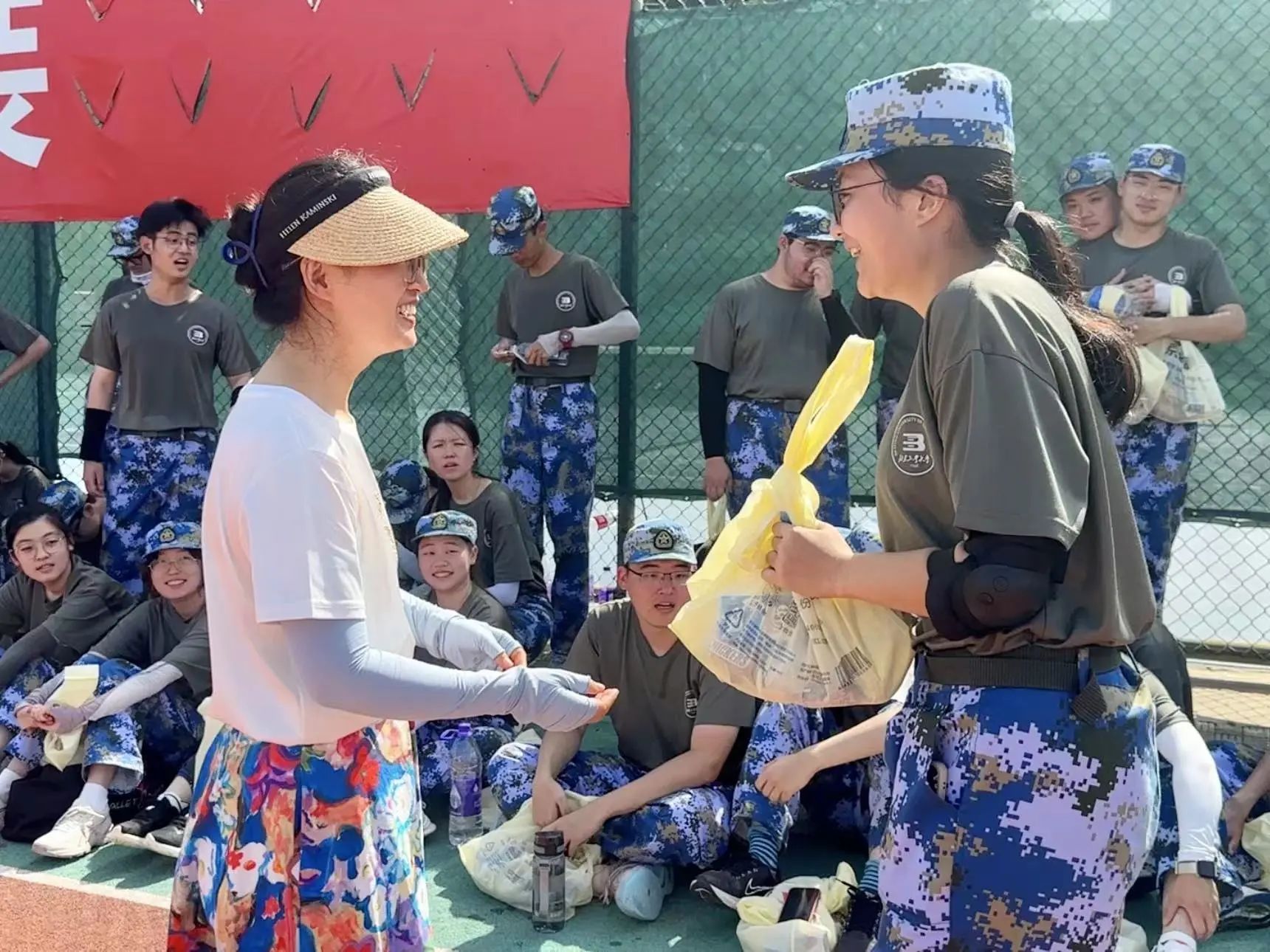 数日高温无法磨灭同学们的意志,随着日程过半,分列式队列行进初见成效。清风细雨吹走了同学们心中的劳累与焦躁。教官每天都反复提醒大家“吃早饭”、“泡泡脚”,放下严格的一板一眼,通过一次次“唠叨”在细节上对同学们给予满满的关爱。学校与学院屡屡为同学们送来消暑物资,副院长袁莉敏老师亲切地慰问了同学们,她对同学们昂扬的士气表示高度赞许,叮嘱同学们在当前高温的不利条件下做好防暑措施,注意休息和补水,鼓励同学们继续发扬不怕苦不怕累的精神,以饱满的精神状态完成后续的训练任务。指导员戴璐老师每日与同学们共同操练,做好后勤保障工作,为同学们及时补充“能量”,助力同学们在酷暑中舒畅满怀,为同学们的训练日程保驾护航。关怀的话语与举动使得同学们暂时忘记了汗流浃背的疲惫,收获了“能量加油站”的满满喜悦。