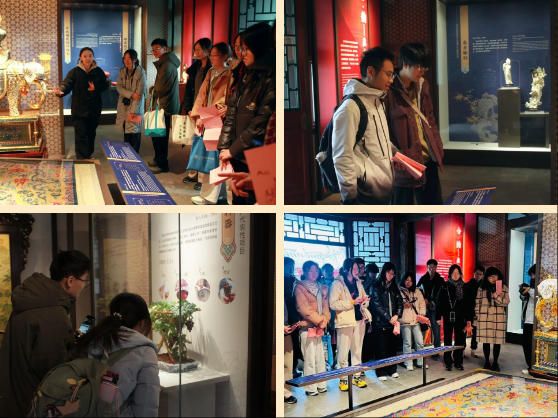 在观摩环节,每一件非遗珍品都成为无声的导师。从形态各异、画有百家姓与五福的兔爷,到集堑刻、镶嵌等绝技于一身的“太平有象尊”,同学们不仅为其精湛工艺所震撼,更从中读懂了“太平盛世”的民族愿景与民间艺术的祈福密码。面对以猛犸象牙精雕细琢的贵妃戏鹦,以及运用花丝镶嵌与雕漆工艺的九龙华灯,同学们在匠人的讲解中,系统性地构建起对京味非物质文化遗产的整体认知,理解了何为“格物致知”的工匠精神。