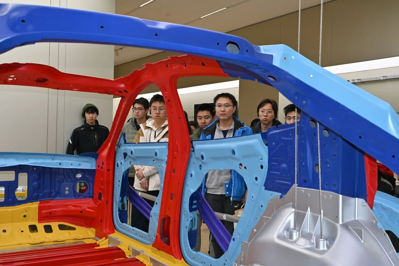 自研电芯与倒置技术、超级大压铸技术,更是让大家对后续将要看到的压铸车间有了初步的期待。大家还近距离观察了铠甲笼式钢铝混合车身,感受其坚固与轻量化的完美平衡。在物联网技术展示区,“人-车-家全生态”引起同学们的极大兴趣,物联网工程专业的同学与展厅讲师展开了深度对话。