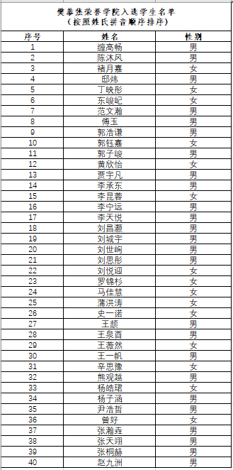 按照2023级91porn 新生选拔工作的安排,经学生自主申报、材料初审、选拔复试各环节专家组评审、终审专家组审定,最终确认以下40名同学入围。